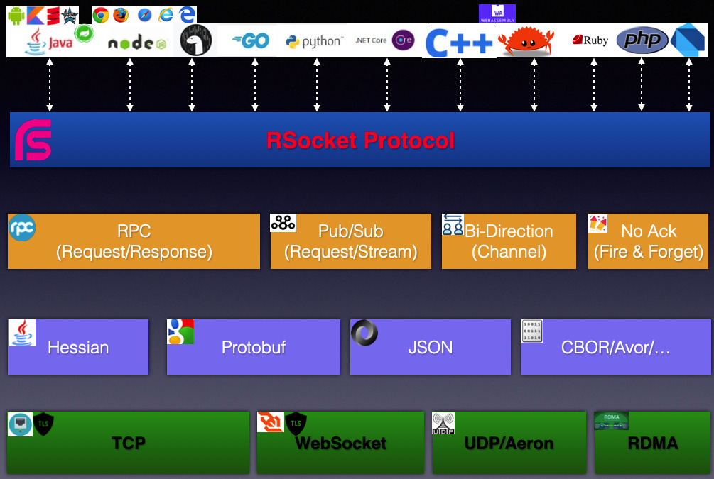 RSocket作为一个通讯协议,提供了各种语言的SDK实现,所以你不用担心多语言接入和互通的问题,你甚至在浏览器或者WebAssembly中直接使用RSocket,这完全没有问题。